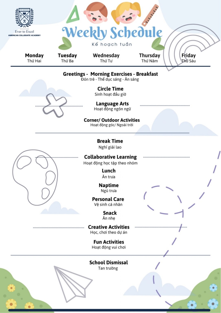 Các hoạt động học tập, vui chơi được ACA sắp xếp linh hoạt và phù hợp với lịch trình sinh hoạt hằng ngày của bé.