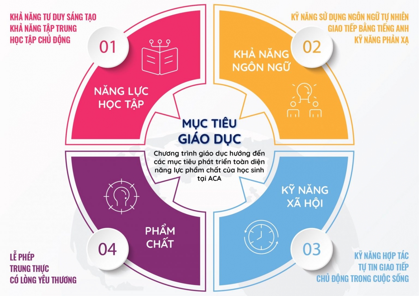 Chương trình giáo dục tại trường Mầm non Song ngữ Hoa Kỳ ACA hướng đến mục tiêu phát triển toàn diện năng lực, phẩm chất, tư duy và kỹ năng của học sinh ngay từ cấp học đầu tiên.